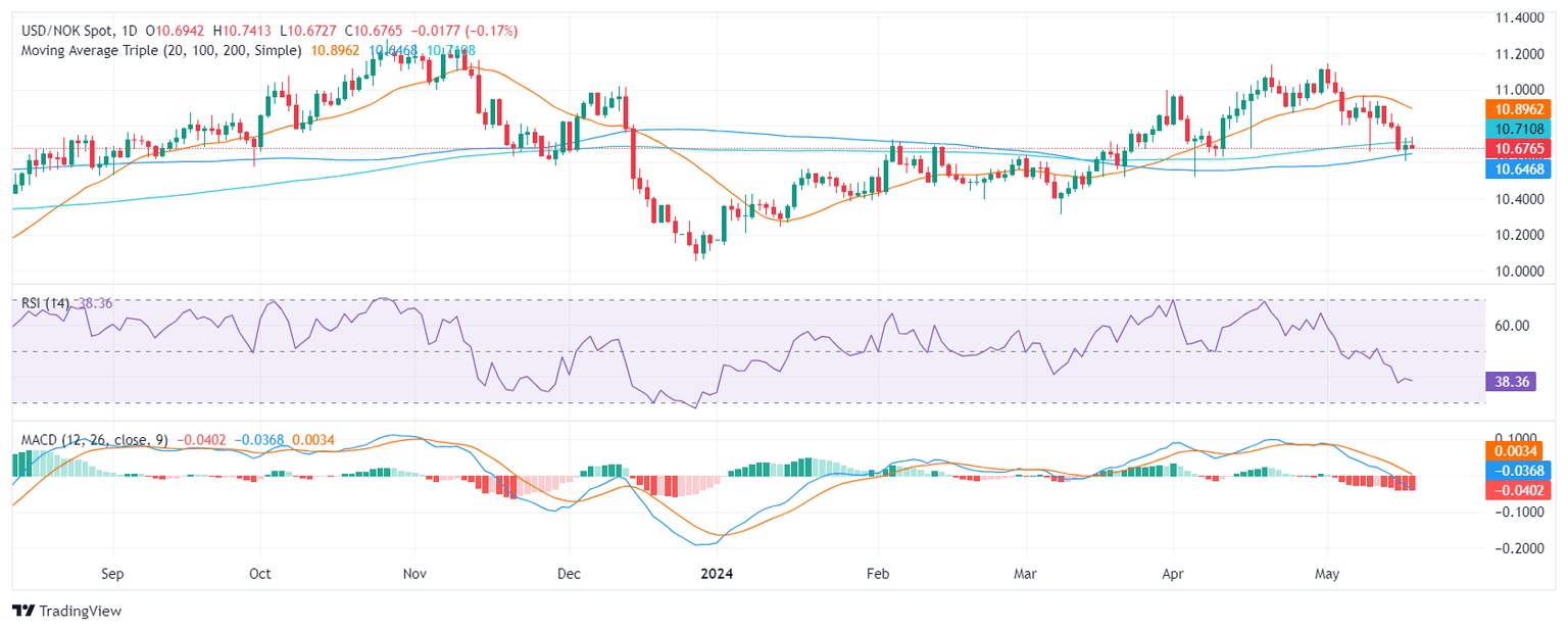 On the daily chart, the Relative Strength Index (RSI) for the USD/NOK pair is in negative territory, marking an overall bearish momentum. There is a gradual descent, indicating a continuous sell-off with no immediate signs of reversal. Meanwhile, the Moving Average Convergence Divergence (MACD) histogram produces flat red bars, suggesting a stable negative momentum supplementing further support to the prevailing downward pressure.