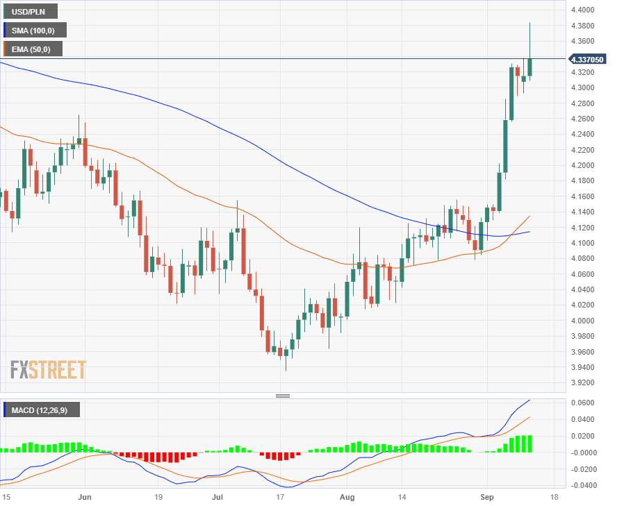The Zloty continues to lose ground against the USD, and the USD/PLN pairing was knocked higher on Tuesday, cracking near-term highs around 4.3350. The pair briefly broke through the 4.3800 handle, and the floor is looking very far away. A significant bottom has been priced into July’s swing low near 3.9500, and any downside momentum sees dynamic support rising from a bullish inversion of the 50-day Exponential Moving Average (EMA) and 100-day Simple Moving Average (SMA).
