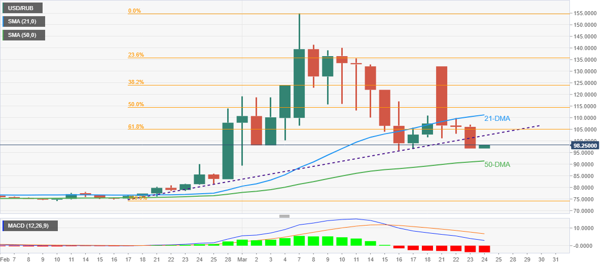 Even so, 61.8% Fibonacci retracement level of February-march upside, around 105.00, will precede the 21-DMA figures close to 111.25 to challenge the USD/RUB bulls.