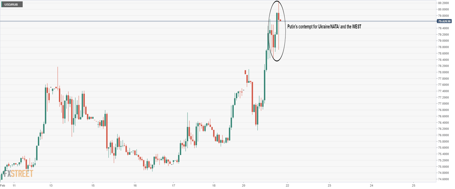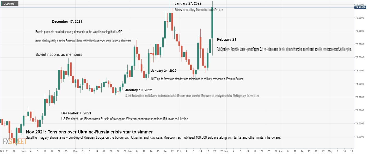 - USD/RUB holds in the bullish territory as the Russian/Ukraine crisis unfolds.