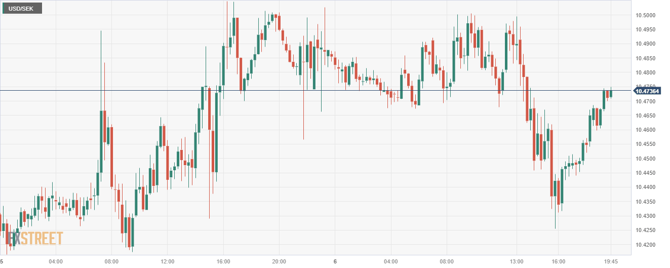 - The USD/SEK hovers near the 10.470 mark after declining to 10.43 earlier in the session.