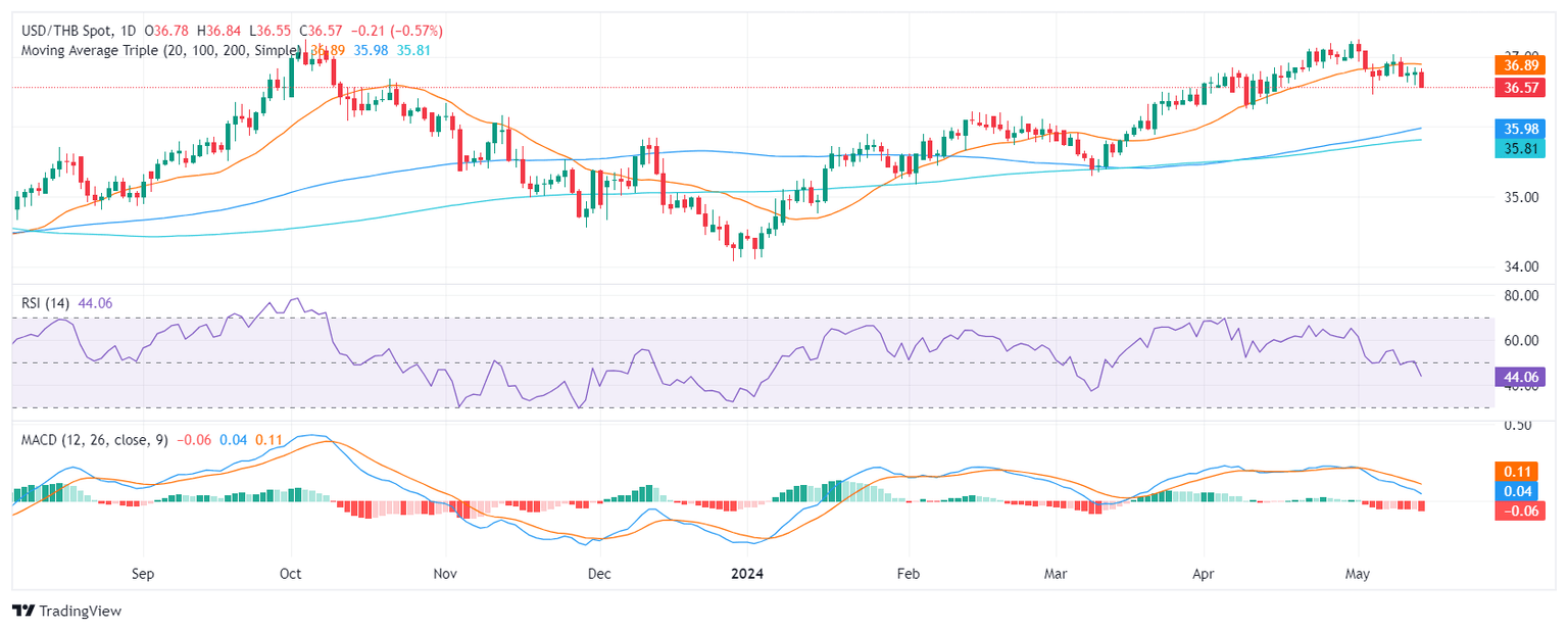 The daily Relative Strength Index (RSI) of the USD/THB pair most recently recorded a level of 45. This RSI reading falls into negative territory, suggesting an elevation of selling momentum. The Moving Average Convergence Divergence (MACD) histogram prints red bars, indicating an increase in negative momentum for the USD/THB pair. The amalgamation of the negative RSI and negatively trending MACD implies a dominance of sellers in the market.