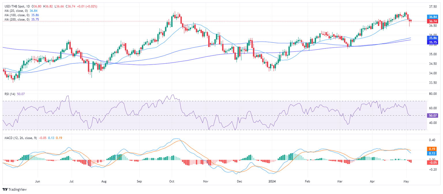 In an overview of the broader performance, the USD/THB is currently exhibiting significant long-term strength. The pair is positioned above both the 100 and 200-day Simple Moving Average (SMA), suggesting a resilient upward trend. On the shorter horizon, the pair remains below the 20-day SMA, which may signify that in the short term, the bear might take the lead. So the daily indicators and the pair’s position below the 20-day SMA may suggest that further downside may be on the horizon.