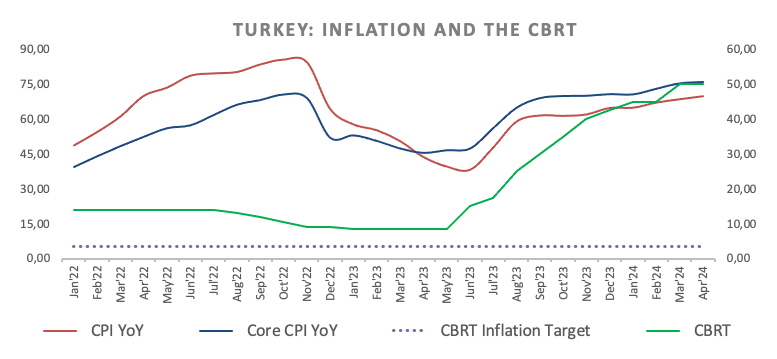 - The CBRT kept the One-Week Repo Rate unchanged at 50.0%.