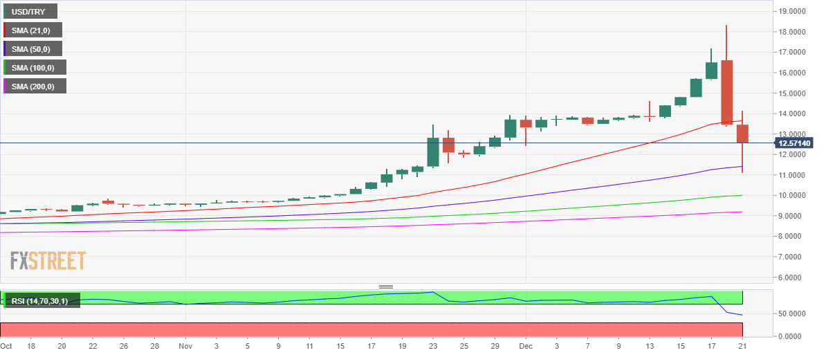 At the time of writing, USD/TRY is losing about 6% on the day, trading around the 12.50 level, having rebounded firmly from monthly lows of 11.10 reached earlier today. Despite the sharp recovery, the pair is up nearly 50% from the levels seen in September this year.
