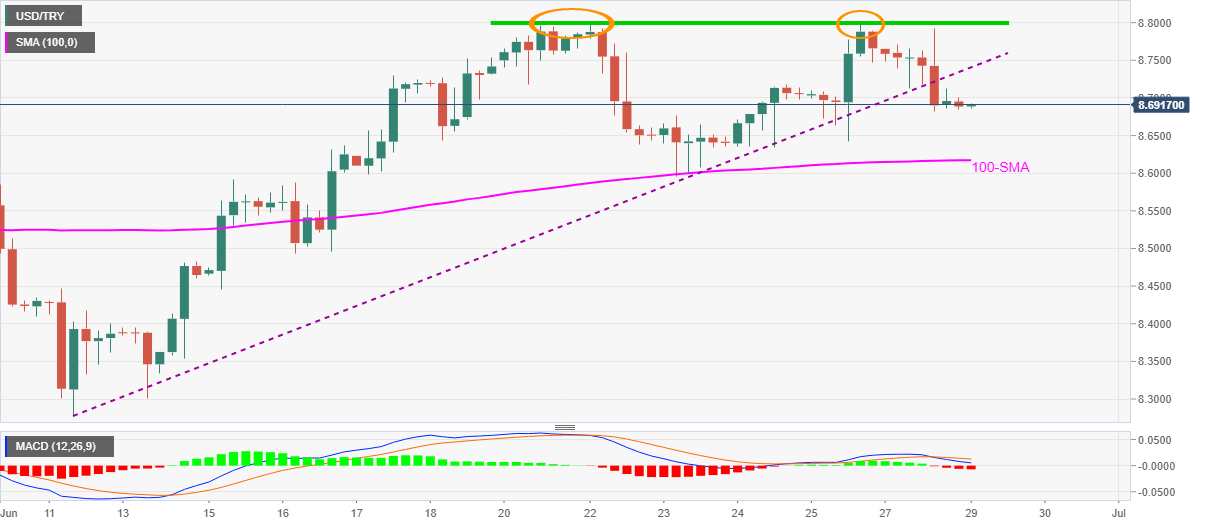 USD/TRY Price Analysis: Aims to confirm double top bearish pattern below 8.8000