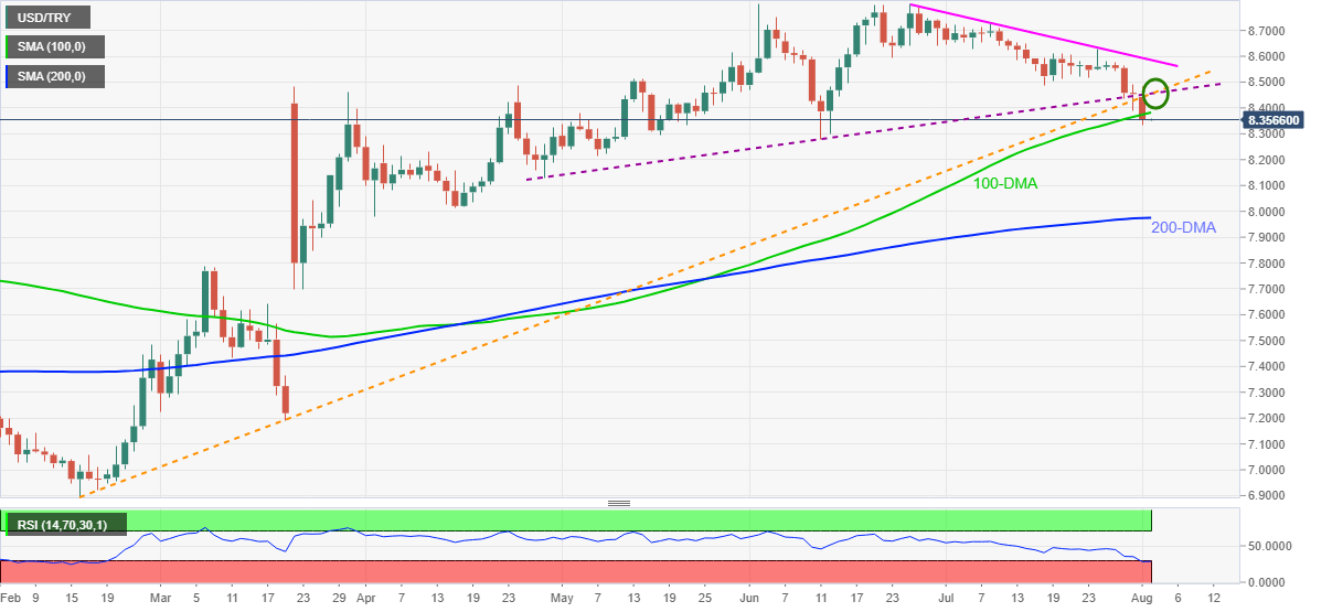 USD/TRY treads water around $8.3563 amid early Tuesday. The Turkish lira (TRY) pair dropped to the lowest since June 14 after breaking ascending trend lines from late April and mid-February, as well as 100-DMA, the previous day.