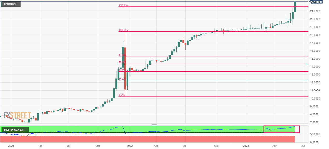 - USD/TRY has witnessed a temporary pause in a rally to near 22.08.