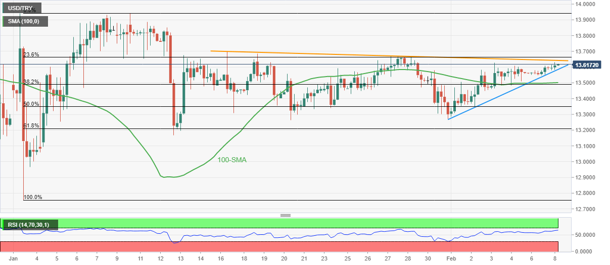 USD/TRY stays on the front foot around a one-week high, up 0.20% intraday near $13.62 while rising for the second consecutive day ahead of Tuesday’s European session.