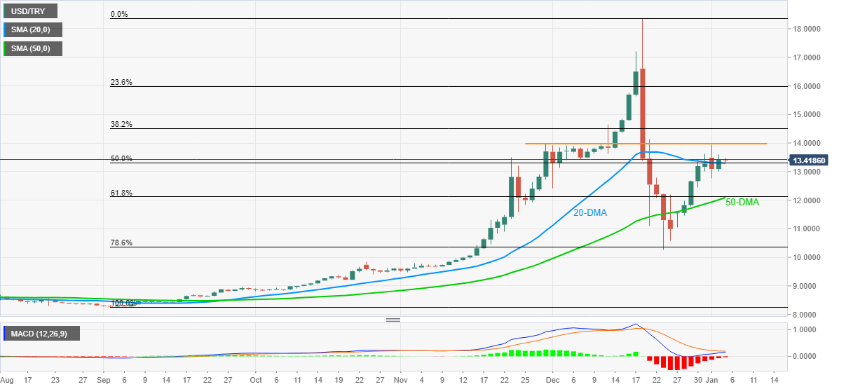 USD/TRY Price Analysis: Seesaws around 20-DMA, $14.00 appears key hurdle