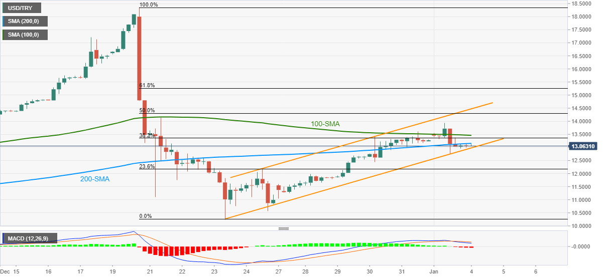 However, a two-week-long ascending trend channel defends USD/TRY bulls around $13.00.