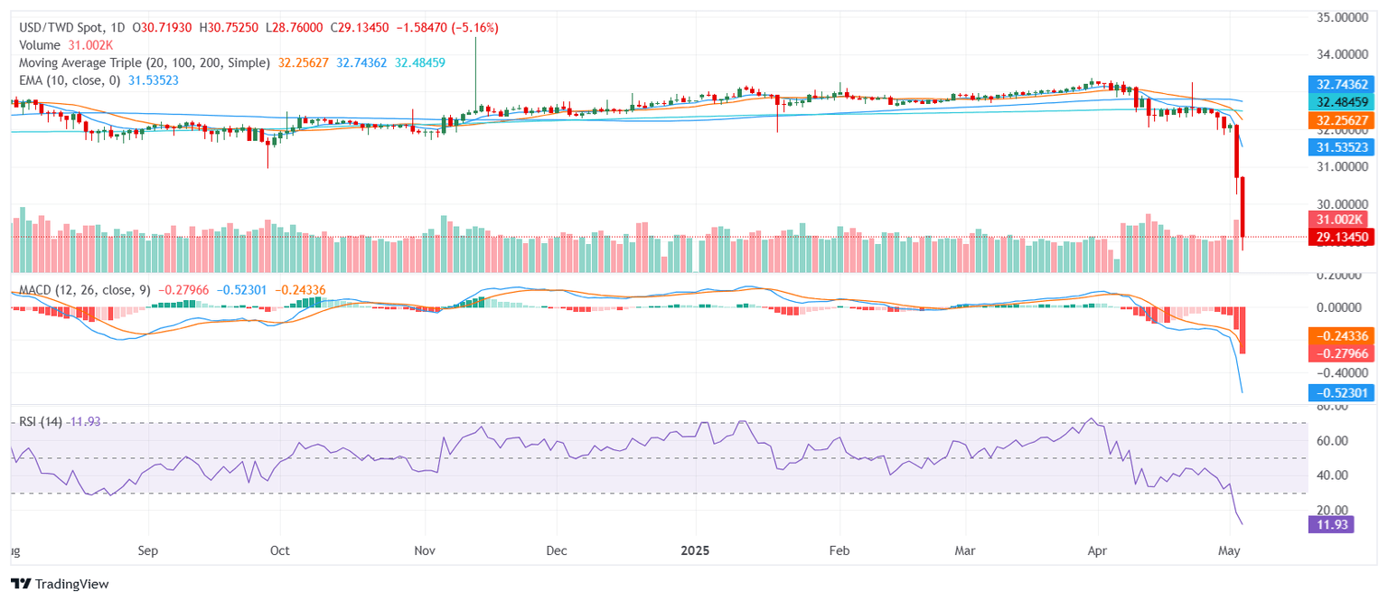 - The pair trades near 28.95 after a two-day collapse exceeding 10%, triggered by speculation Taiwan is revaluing the TWD.