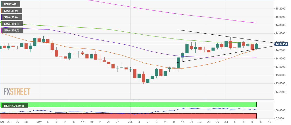 Acceptance above the 100-DMA could threaten the triangle resistance at 14.43, above which the buyers will aim for the July 2 high at 14.51, as it would lead to an upside breakout.