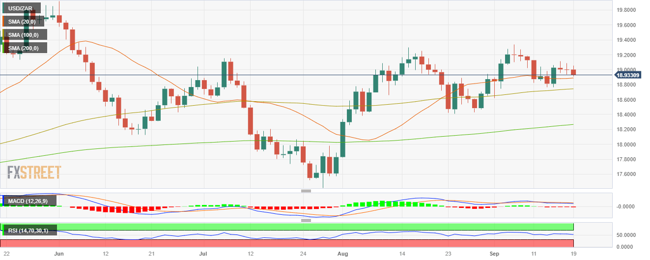 - USD/ZAR declined towards 18.933, near the 20-day SMA.