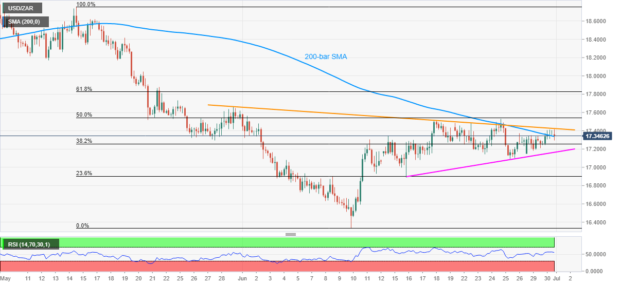 USD/ZAR seesaws around 17.35 during Wednesday’s Asian session. The quote rose for the consecutive three-day to Tuesday. Though, key upside barriers question the pair’s additional north-run.