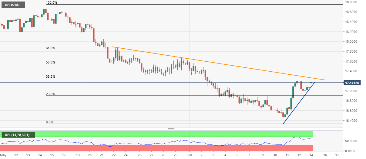 USD/ZAR remains on the front foot while taking the bids near 17.17 during Monday’s Asian session. The pair extends the recovery moves from Wednesday and heads to a downward sloping trend line from May 22 by the press time.