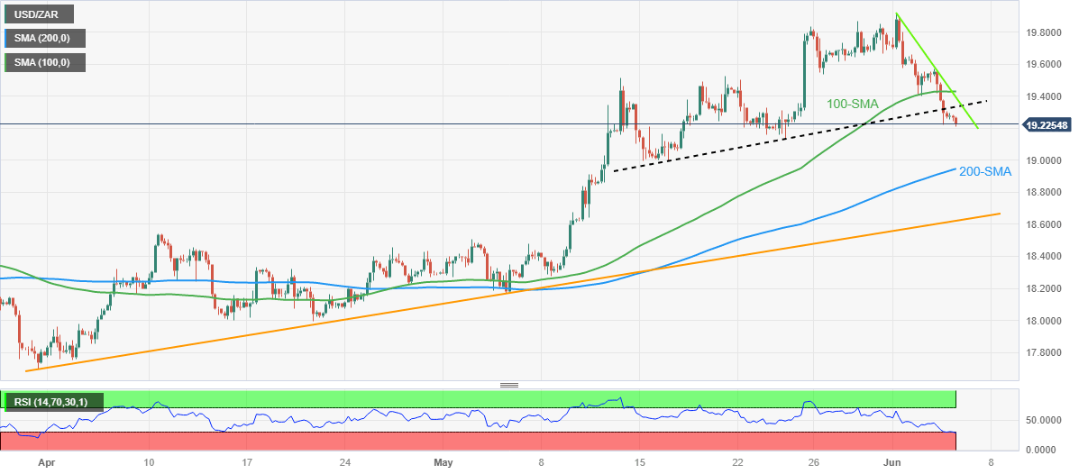 That said, a clear break of the 100-SMA and a three-week-old support-turned-resistance adds strength to the bearish bias about the USD/ZAR pair. The same direct the sellers toward the mid-May low surrounding the 19.00 round figure.