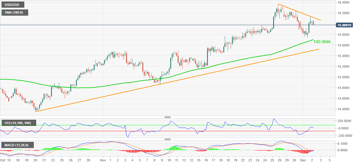 Despite marking the biggest rebound in a week, USD/ZAR steps back from a short-term resistance line, offered around $15.97 during early Thursday morning in Europe.