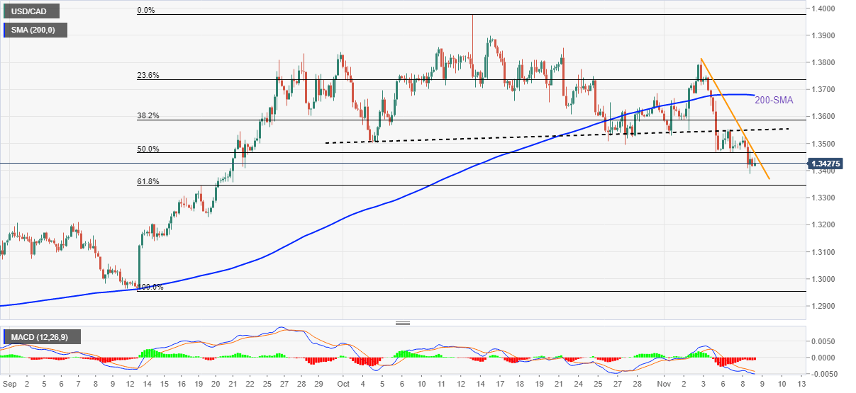 A one-week-old descending trend line portrays the quote’s recent weakness. Also keeping the sellers hopeful are the bearish MACD signal and the clear break of the previous support line from early October. Additionally, the pair’s sustained trading below the 200-SMA also adds strength to the downside bias.