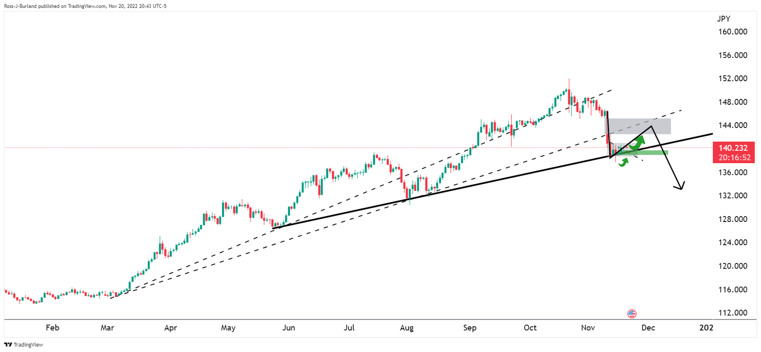 USDJPY remains on the front side of the trend in the main, albeit breaking down into test the 140/137s. There are prospects of a deeper move on a break below the current trendline as the following will illustrate from a bearish perspective: