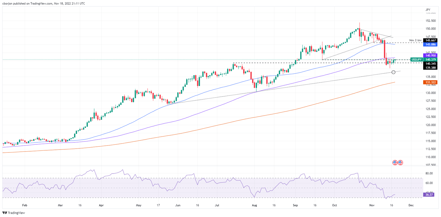 Albeit tumbling in the last week close to 5%, the USDJPY remains upward biased. At the time of typing, the USDJPY sits comfortably above 140.00. Nevertheless, the USDJPY could not crack the 100-day Exponential Moving Average (EMA) at 140.95, which could have exacerbated a rally toward the November 11 daily high at 142.48. It should be noted that the Relative Strength Index (RSI) exited from oversold territory, suggesting that USDJPY buyers are outpacing sellers.