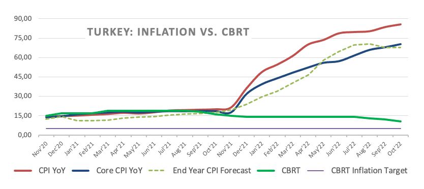 On the latter, inflation in Türkiye rose to a new 24-year high at 85.51% in the year to October when gauged by the headline CPI and 3.54% from a month earlier. In addition, the Core CPI gained 70.45% YoY and Producer Prices advanced 157.69% vs. October 2021.
