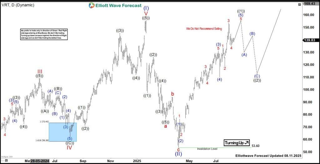 VRT favors impulse sequence in ((1)) of I of (III) after (II) pullback ended at $53.60 low in April-2025. It favors upside in (5) of ((1)) & soon pullback in ((2)), which provides buying opportunity later.