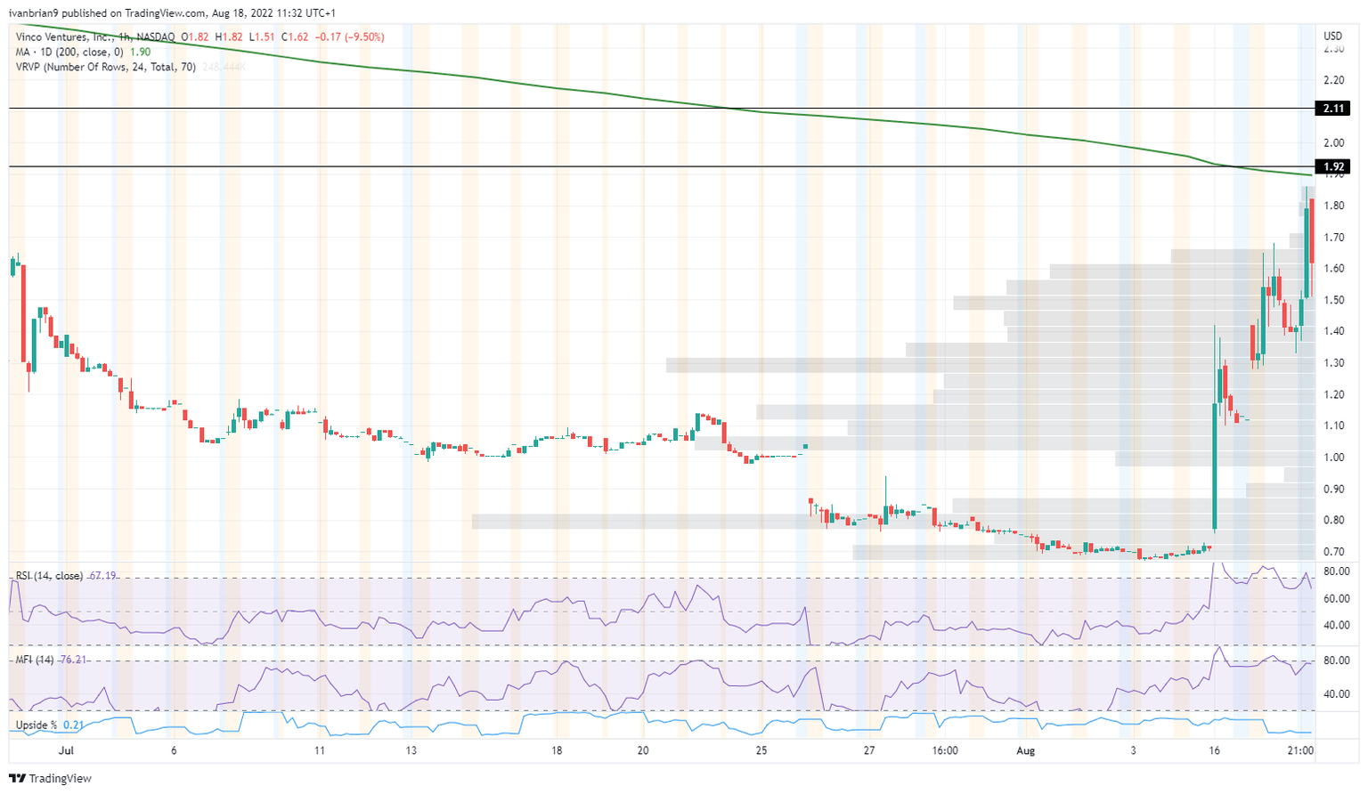Note that BBIG is up 30% in the past month, so it has already exhibited a strong move. All of that gain has come in the past two days though. BBIG was up 58% on Tuesday before Wednesday's 23% gain. Already the intraday high on Wednesday at $1.68 is the key to maintaining this momentum with shares currently at $1.65 in the premarket.