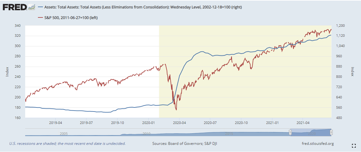 Equity markets continue to set more and more records as 2021 progresses with any dip in danger of being devoured by hungry buyers. The Fed wobble from last Thursday and Friday set up the latest dip and sure enough record highs swiftly followed. The Fed's balance sheet hit another record high keeping the strong correlation in place, the Fed being the lead indicator. The chart below shows the correlation and note that the Fed balance sheet hit a record high again last week.