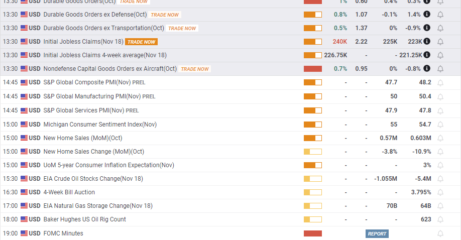 Oil has spiked as The Wall Street Journal's report was denied by the Saudi government. This is inflationary although it has since fallen as the EU looks to put a low cap on Russian oil. The EU gas cap is put at a very high level. Apple (APPL) looks to be in trouble with reports of major disruptions and protests at its Foxconn-owned supplier factory. Finally, we will get FOMC minutes later. Given how hawkish Powell was in the press conference, there is no reason to expect the minutes to be much different.