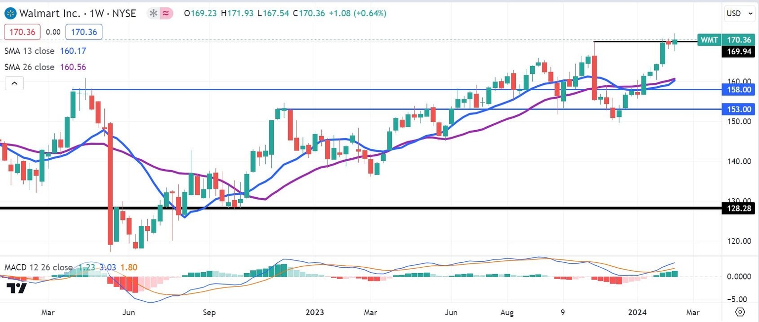 Walmart stock has remained in an uptrend since June of 2022. With the weekly chart’s Moving Average Convergence Divergence (MACD) indicator displaying a bullish crossover, WMT stock appears likely to make a new all-time high on Tuesday.