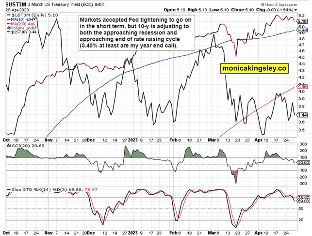 The elephant in the room is continued deposits outflow – and it doesn‘t end with FRC no matter how much KRE and XLF rejoice. Fed is still raising rates, Fed is still shrinking its balance sheet, and the Treasury needs to roll over almost $7T in debt this year alone (and some $3T next year). Inflation, core components especially, aren‘t declining nearly fast enough, personal income is up, job market in spite of all the increase in unemployment claims still quite hot – summing up, the Fed has no reason to pivot.