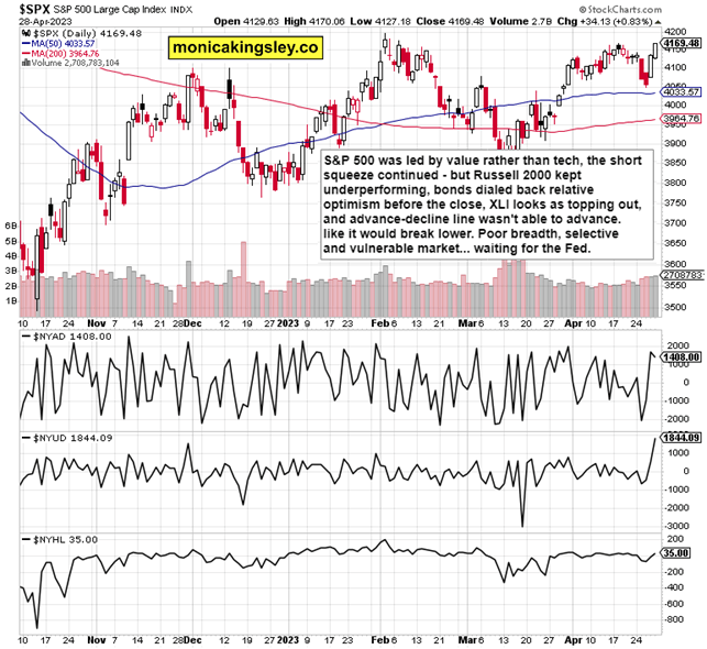 S&P 500 continued the short squeeze, more than vindicating my call for no setback Friday. Market breadth and internal strength isn‘t though that positive – yet markets are celebrating as if the banking crisis was over, as if the Fed pivoted, or as if Big Tech earnings were to lend similar resilience to other industries‘ results. Somehow, the negative UPS forward guidance has been quickly lost as well.