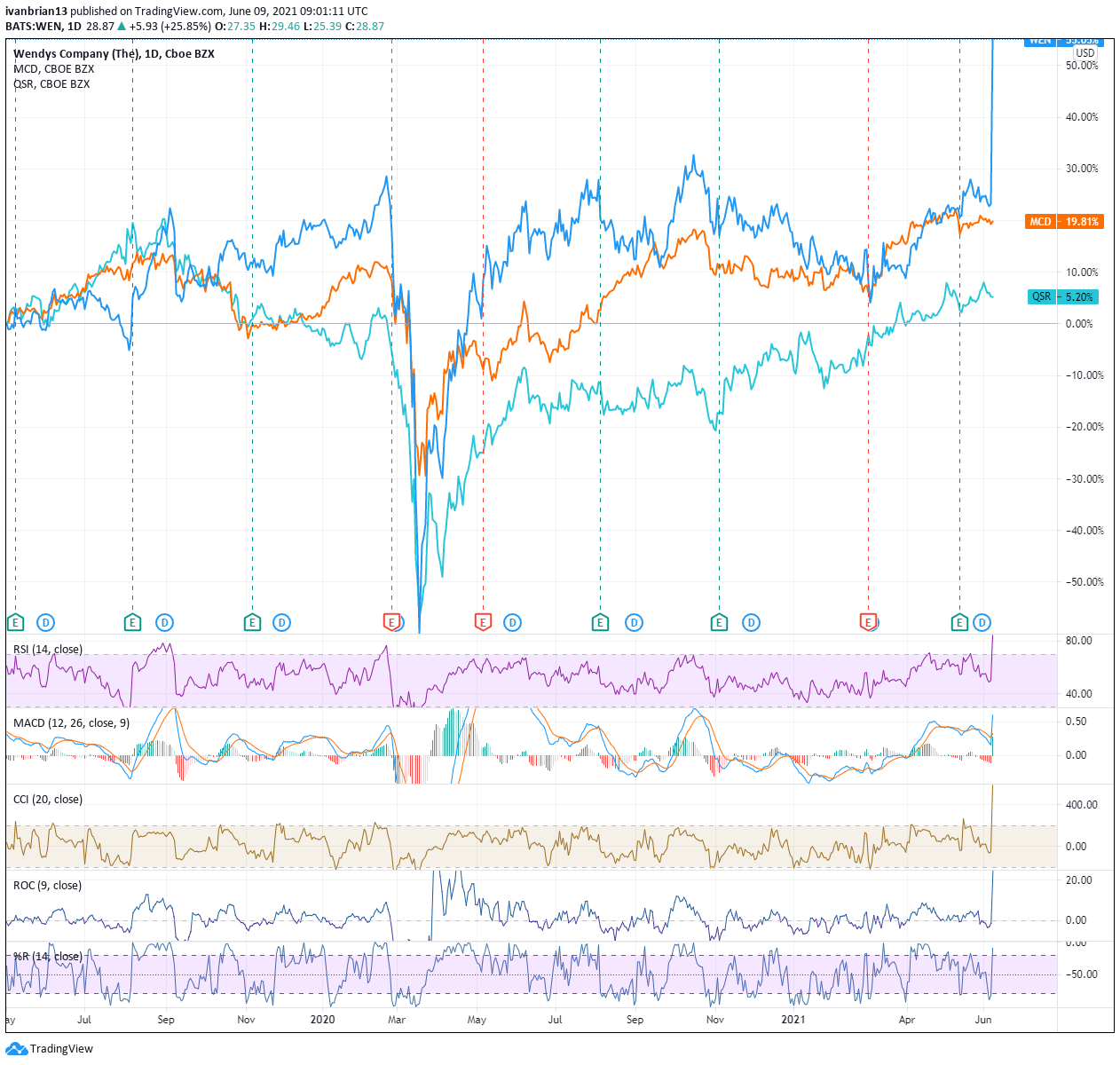 The interesting thing to note is the argument made by WallStreetBets for Wendy's (reopening, new menu, etc.) should also be directly applicable to McDonald's (MCD) shares and Restaurant Brands Burger King (QSR) shares. However, a quick glance at the chart below shows this is not the case. Why is this? Could it be this is a frenzy with no real reasoning behind it or does it matter?