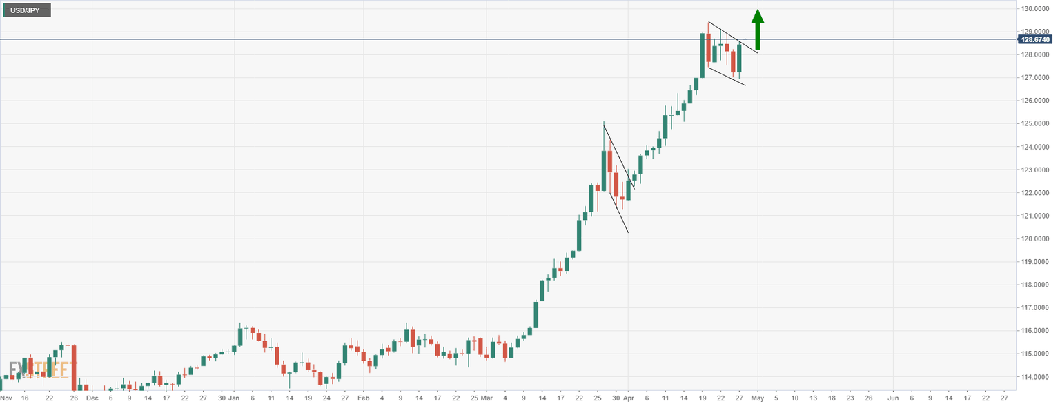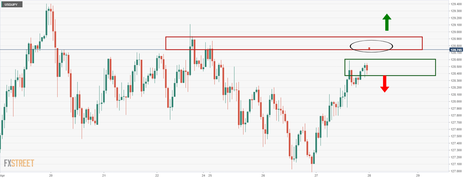 ...the price is testing the key resistance area ahead of the event. Bulls will need to get through 129.00 and hold the fort above there for a convincing case for higher for longer. On a switchback, a break below the prior lows near 128.35 could be important.