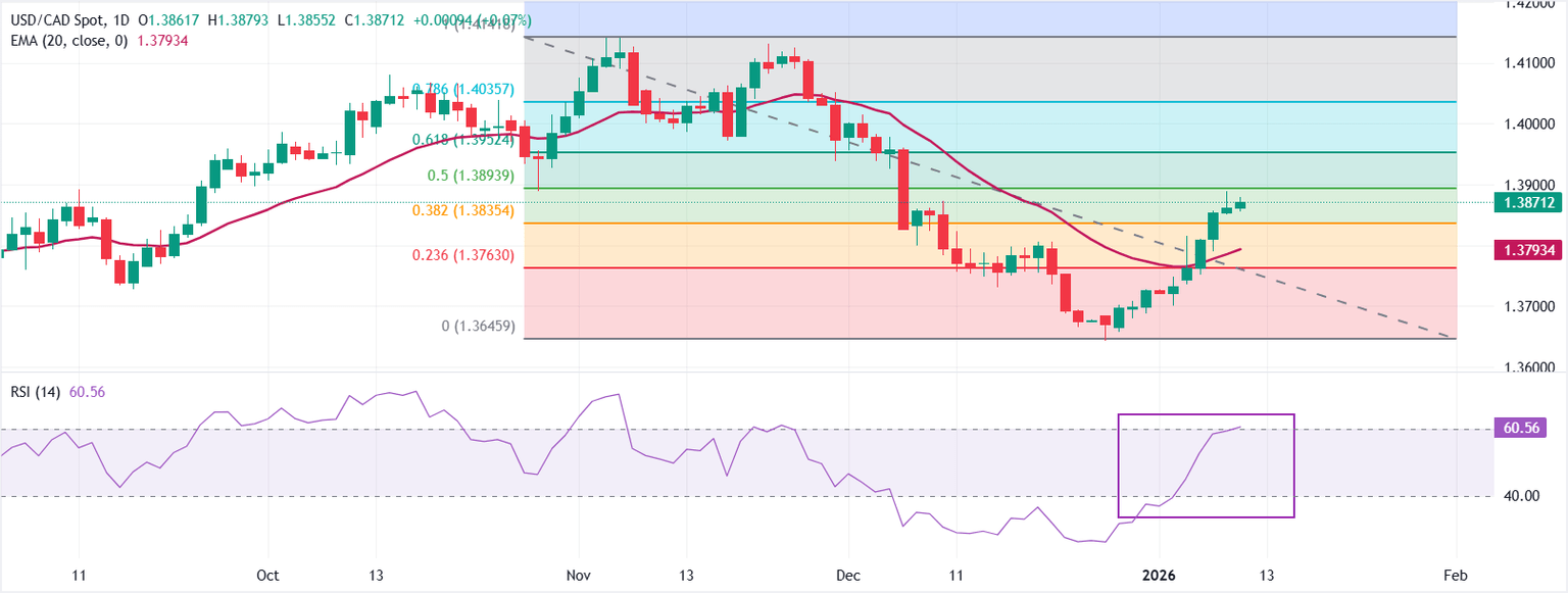 USD/CAD extends its two-week-long rally to near 1.3871 on Friday ahead of the US NFP data release. The 20-day Exponential Moving Average (EMA) has turned higher to 1.3793, and the pair holds above it, preserving a near-term bullish bias.
