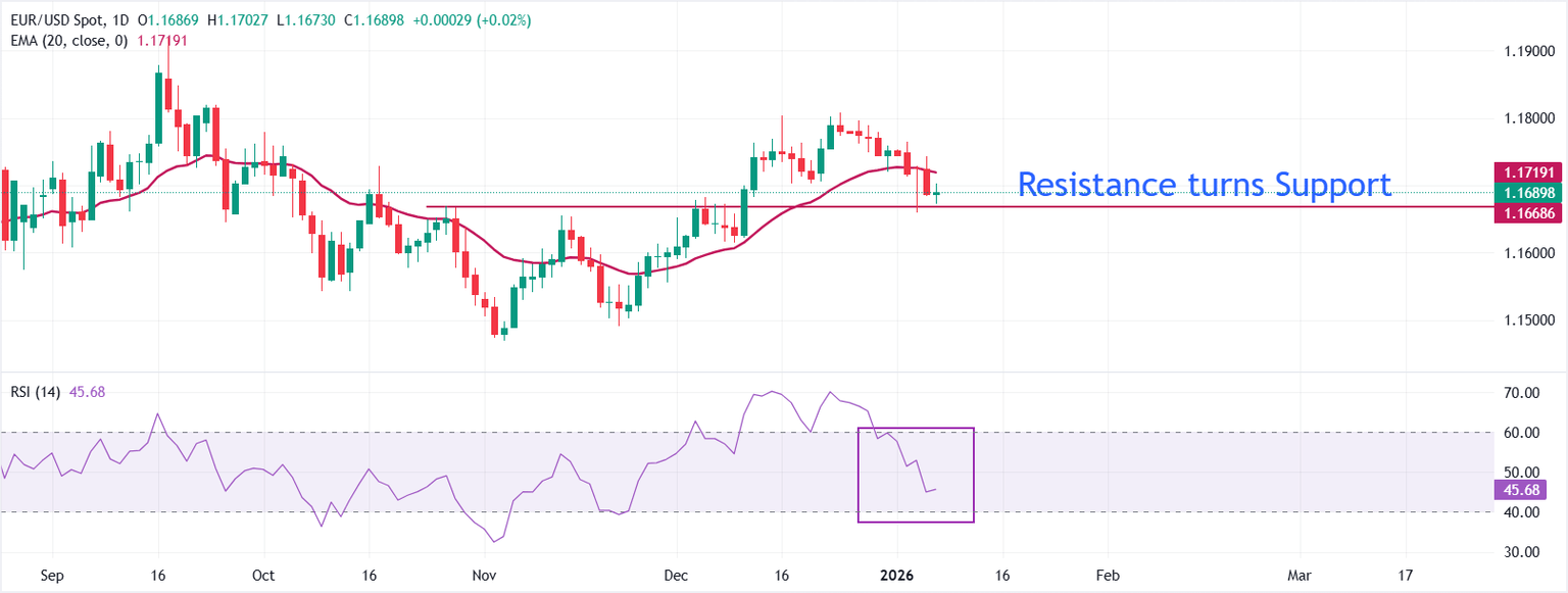 EUR/USD trades flat at 1.1690 at the time of writing. The pair sits below the 20-day Exponential Moving Average at 1.1719, which has begun to turn lower and caps rebounds.