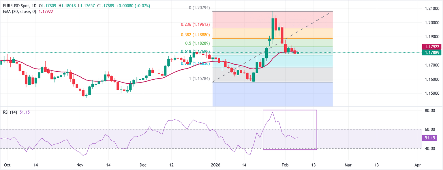 EUR/USD trades higher at around 1.1789 at the press time. The 20-day Exponential Moving Average (EMA) rises at 1.1792, with spot holding just beneath and capping initial recovery attempts. A decisive close above the 20-day EMA would strengthen the near-term bid.