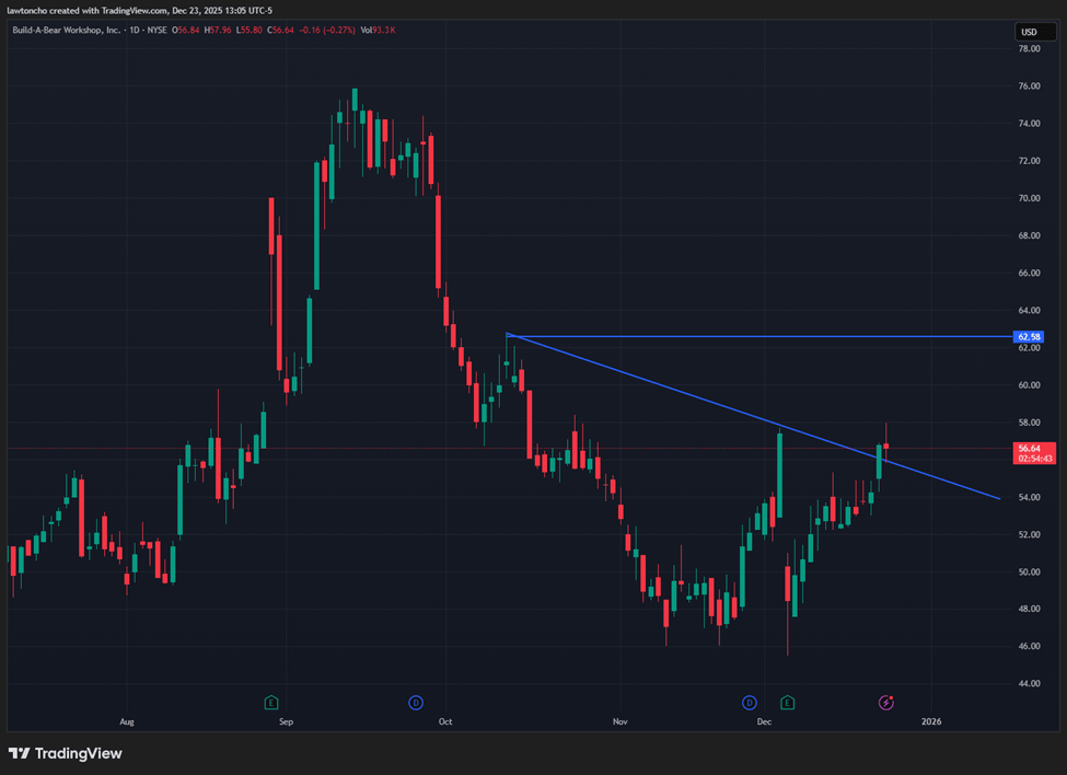 When I look at Build-A-Bear Workshop right now, what immediately stands out to me is the technicals. The stock is currently breaking out of a downsloping trendline, which is something I always pay close attention to when evaluating potential upside opportunities. From a market perspective, this is the type of technical development that often signals a shift in momentum, especially when it occurs ahead of a seasonally strong period.