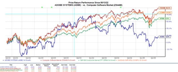 ADBE is still down 5% in 2025 and is only up +12% over the last three years to widely trail the broader indexes and its Zacks Computer-Software Industry’s gains of nearly +100%.