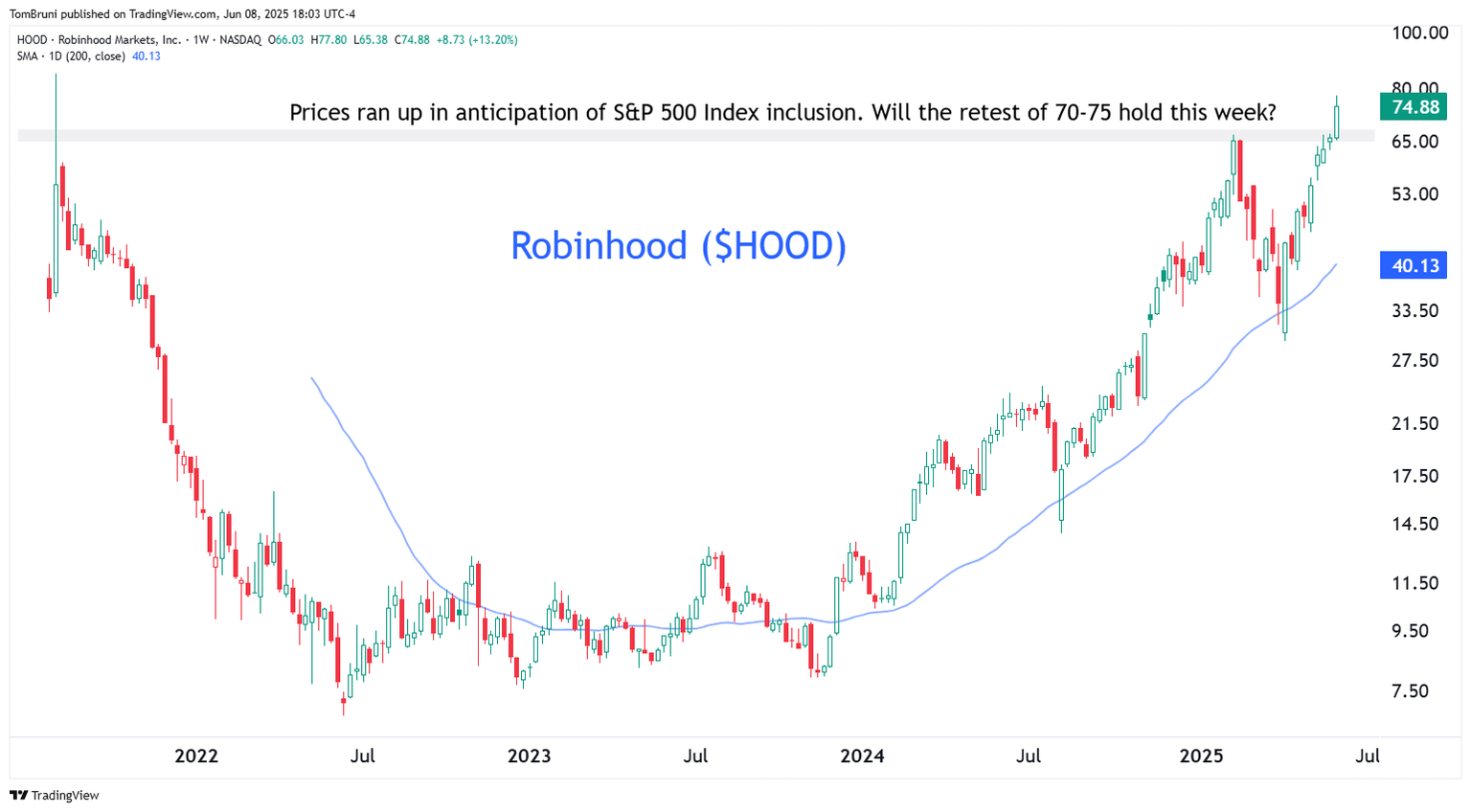 If we’re talking about retail investors, crypto, and bull market behavior, then we need to end with a look at Robinhood ($HOOD). The stock broke out above resistance near 70-75 last week on rumors that it would be added to the S&P 500 Index during Friday’s rebalancing.