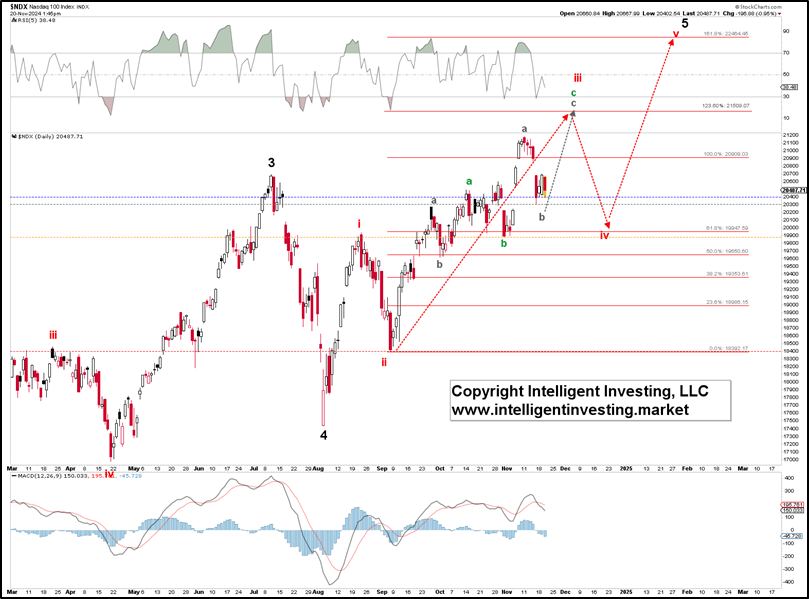 Fast-forwarding and the stock market rallied strongly in response to the election, which former president Donald Trump won by a landslide. Yes, markets like certainty. However, the “Trump Trade” lasted only four days, as most gains were given up the following week. The next catalyst is NVIDIA Corporation’s (NVDA) earnings. Our previous update states, “Since the NDX and NAS are often tied to the hip, it is uncommon for the two to have vastly differing EWP counts.” Below we show the NASDAQ (NAS), where we now have a better-defined potential third wave (W-3) top and W-4 underway.