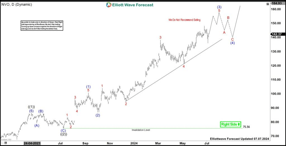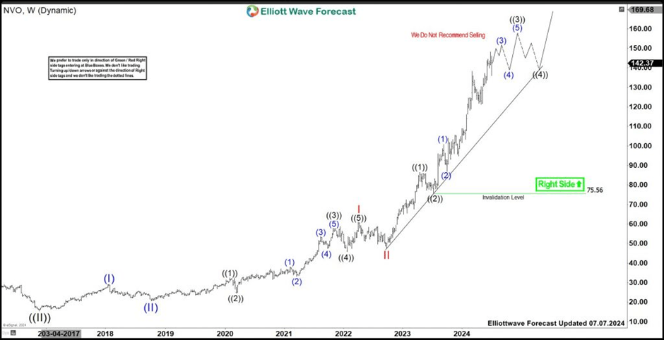 NVO is trading at all time high in bullish weekly impulse sequence in ((3)) of III & expect to remain supported in 3, 7 or 11 swings pullback to resume higher. It favors upside in (3) & soon will starts correction, that offers trading opportunity.