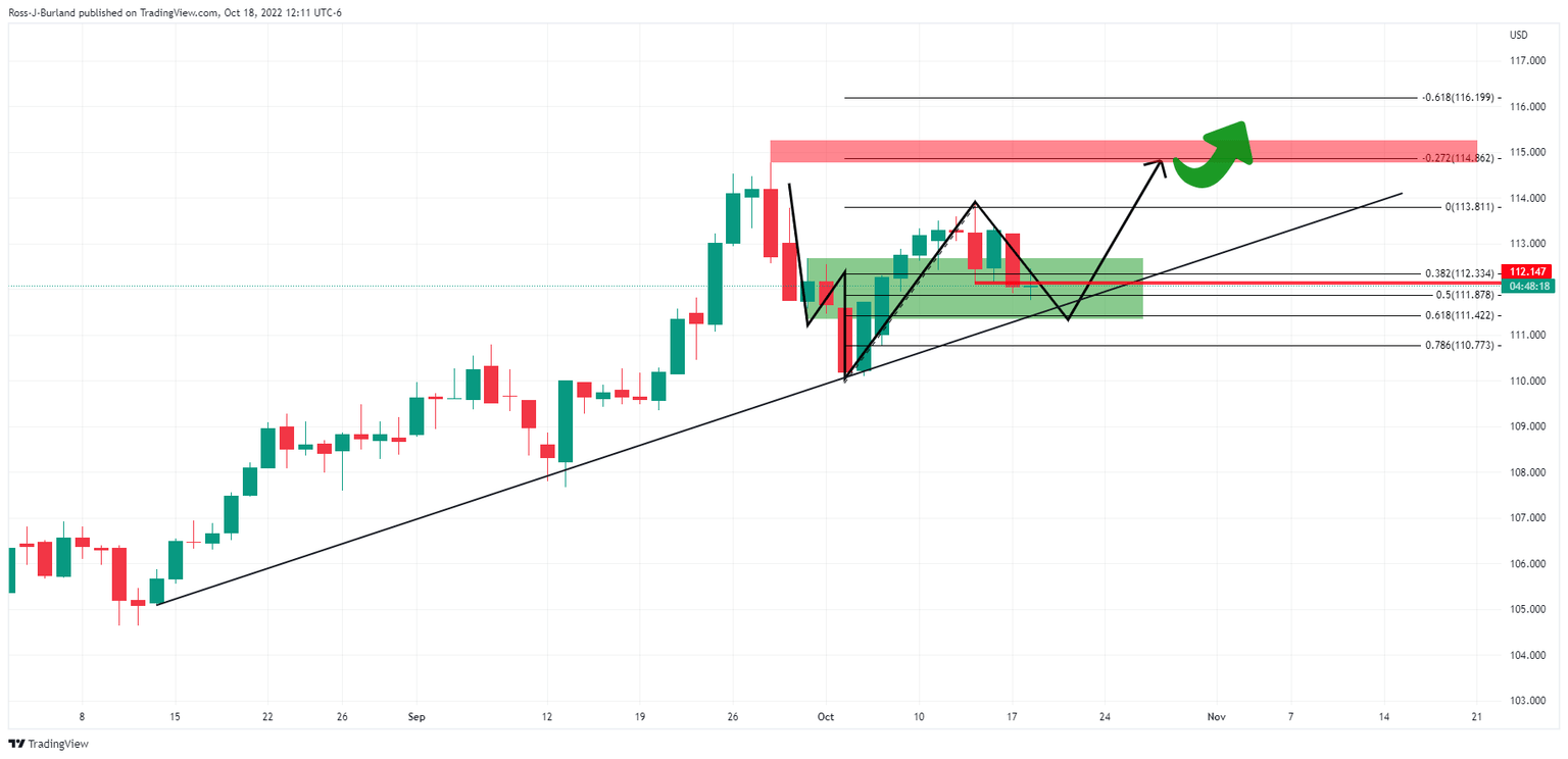 Meanwhile, it's been a mixed day in terms of risk appetite as investors weigh up the earnings outlook against rising interest rates. The narrative surrounding the Federal Reserve remains the key driver, which continues to weigh on the global financial markets. Wall Street's main indexes gapped to the upside at Tuesday's open as strong earnings from Goldman Sachs and Johnson & Johnson that lifted hopes that upbeat corporate reports could soothe market worries about a potential recession due to rising inflation and interest rates. However, at the time of writing, the S&P was up just 1.00%, but still up from the lows of 3,686.53 and down from the 3,762 highs. US treasuries were little changed, with the 10-year yield at 4.01%. The DXY was trading flat at 112.07 and had moved between a low of 111.773 and 112.455.