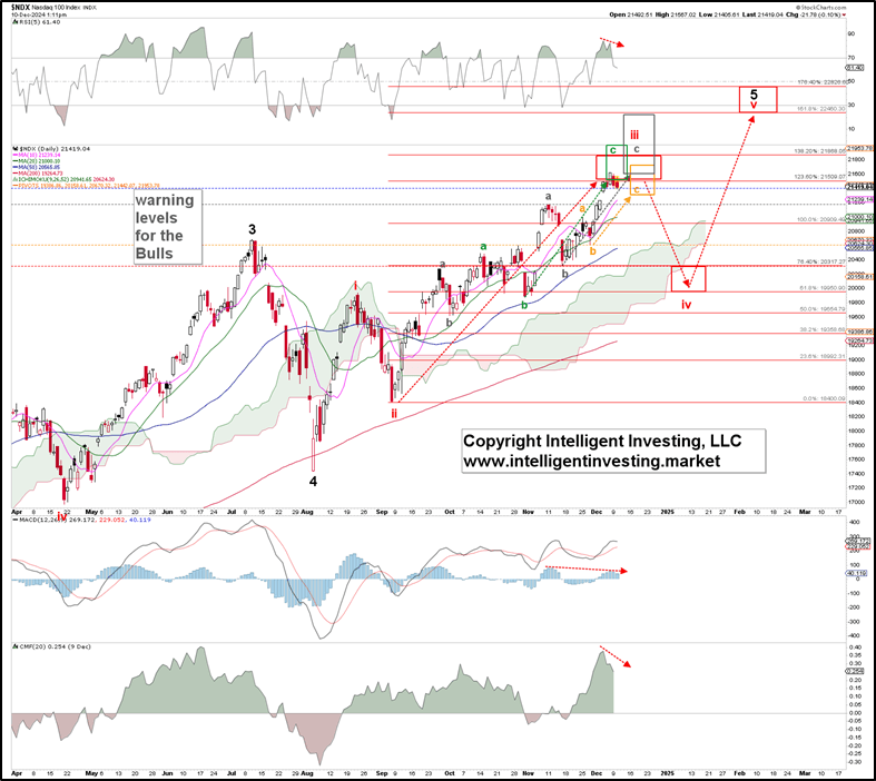 Figure 1. NDX daily chart with detailed Elliott Wave count and technical indicators