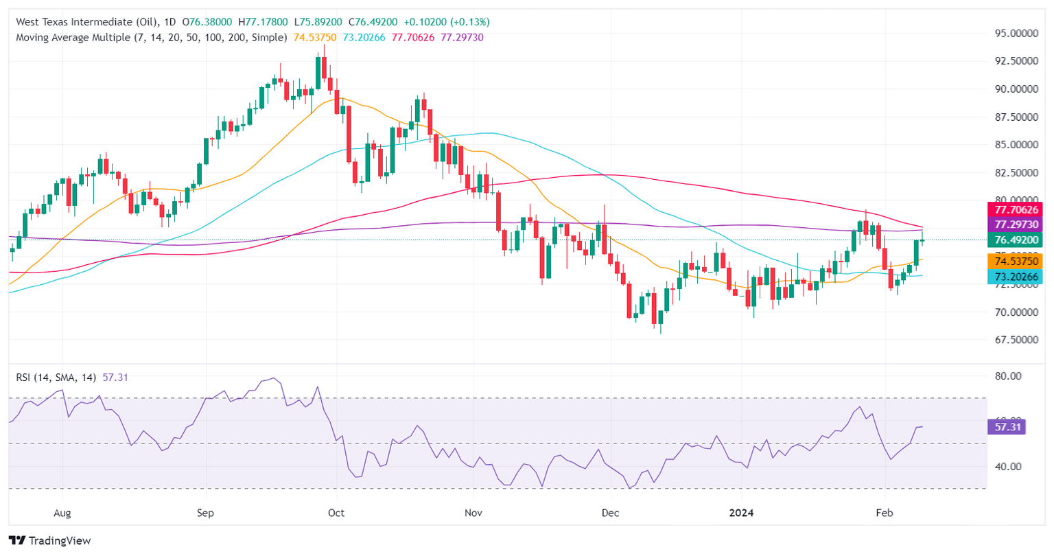 West Texas Intermediate (WTI), the US crude oil benchmark, rises 0.25% late in the North American session as the Israel-Hamas conflict escalates with Israel rejecting a ceasefire offer. That, along with diminished production in oil refined products, sponsored WTI's advance, as it trades at $76.54 per barrel.