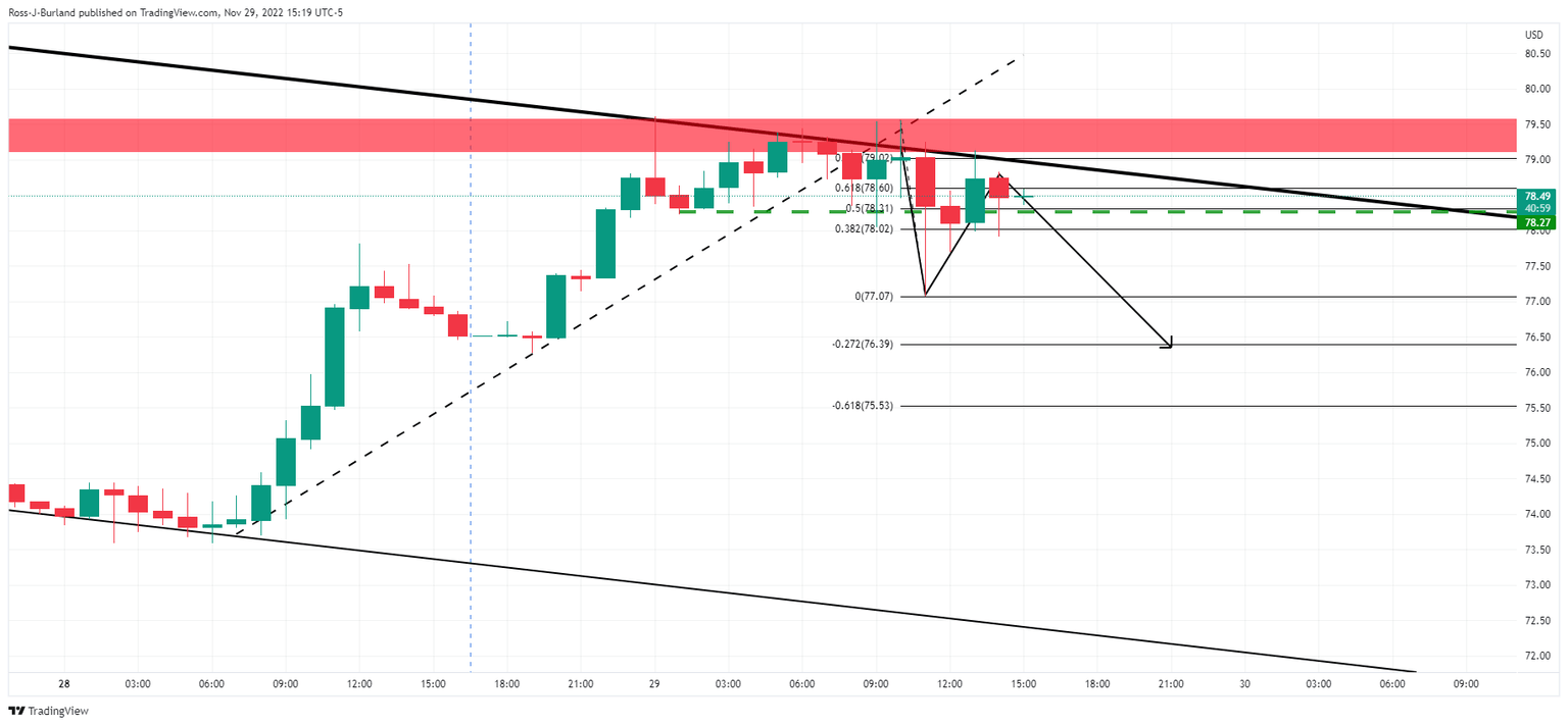 West Texas Intermediate is higher on the day so far, up over 2.45% at the time of writing, having ranged between a low of $76.03 and $79.61 so far. The price has been consolidating at the top of a channel and the prior day's short squeeze. Risk markets were soft amid light activity as month-end approaches.