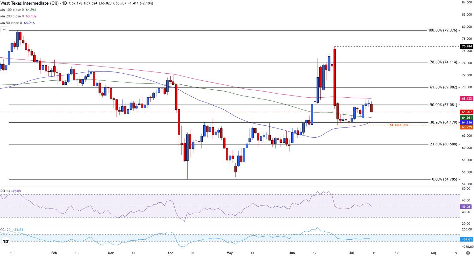 Price action on the daily chart shows WTI pulling back after testing the 50.0% retracement level, located at $67.08.