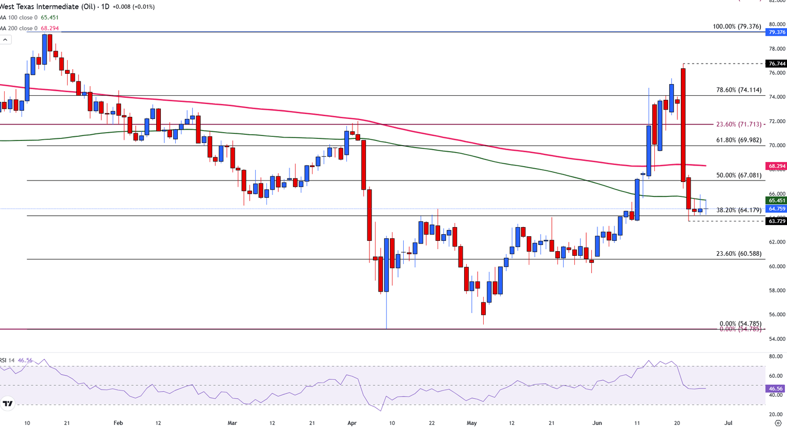 - WTI remains supported by the $64.00 psychological level, but easing tensions in the Middle East limit near-term gains.