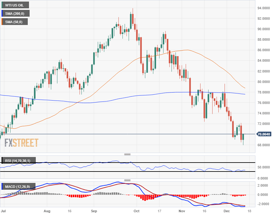 WTI’s Wednesday rebound sees WTI clambering back into $70, but US Crude Oil remains deeply in the cut, trading on the south side of the 200-hour Simple Moving Average (SMA) near $71.50. WTI hasn’t come within touch range of the 200-hour SMA since intraday bids dropped away from the moving average at the beginning of December when barrel prices dropped from $76.50.